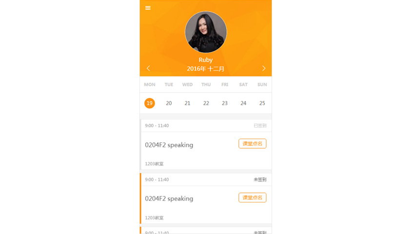 • 個(gè)人首頁(yè):    按周查看個(gè)人課程信息及簽到記錄、課堂點(diǎn)名(僅老師端)